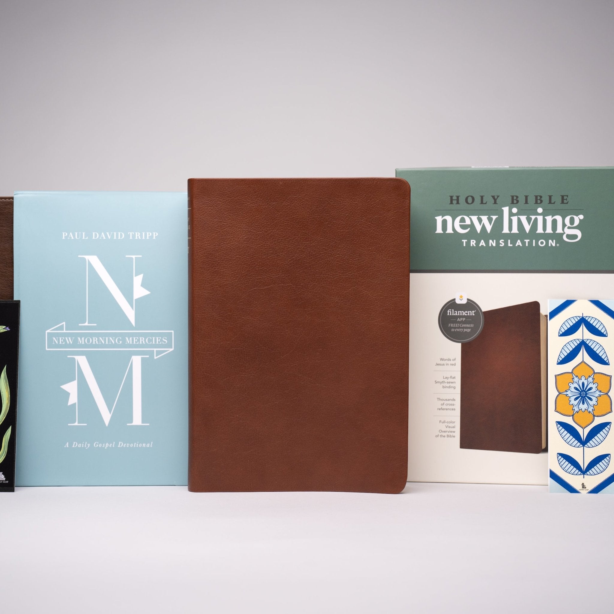 This gift includes:  New Morning Mercies devotional by Paul David Tripp and a large print, leather bound Bible in the NLT or NIV version as well as a book mark.