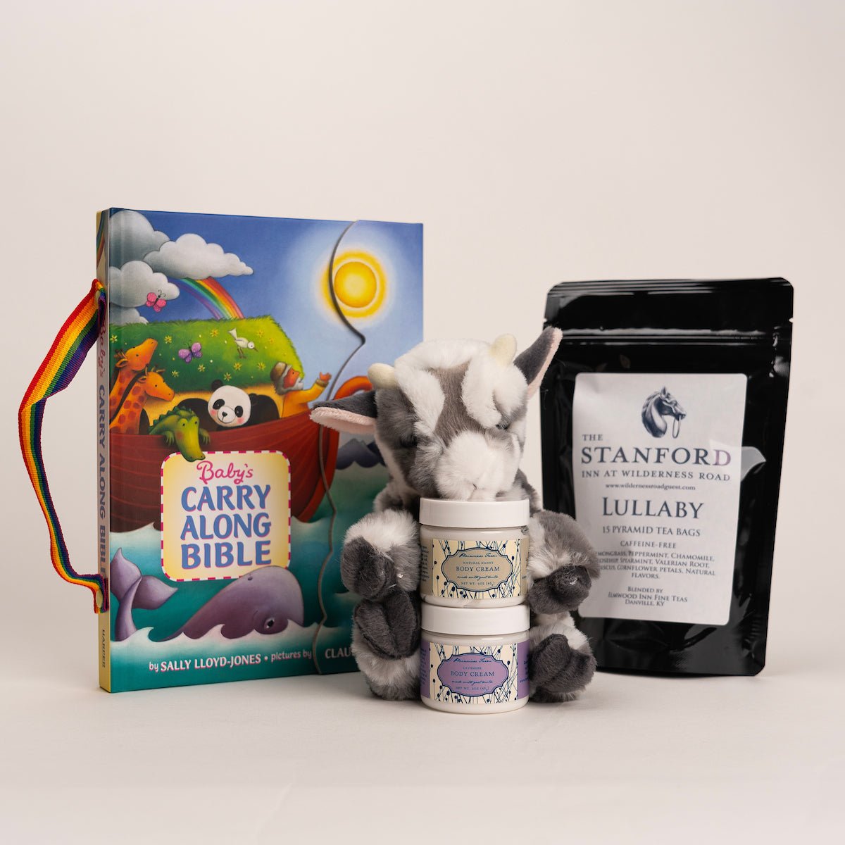 Option 1: Baby's Carry Along Bible, Elmwood Inn Lullaby Tea, Plainview Farm 2 oz sized Natural Nanny & Lavender Body Creams, and a sweet Lil' Baby Goat stuffy