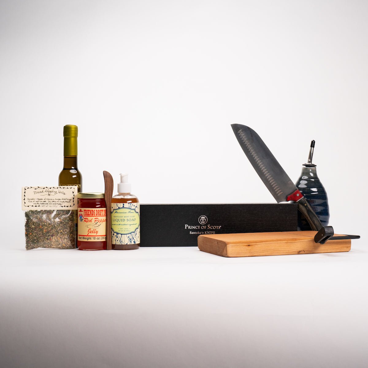 Prince of Scotts knife, Kentucky Olive Brand Olive Oil, Handcrafted Oil Cruet, Wooden Cheese Slicer, Friends Drift Inn Jam/Jelly (flavors may vary), Flag Fork Bread Dipping Herbs and Plainview Farm Kentucky Mint Julep Liquid Soap